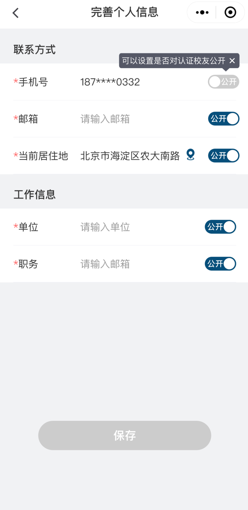 请填写邮箱、所在地(国内可直接点击图标在地图上选点,国外请输入文字信息)、工作单位和职务,这里可以根据需要选择是否对校友公开。