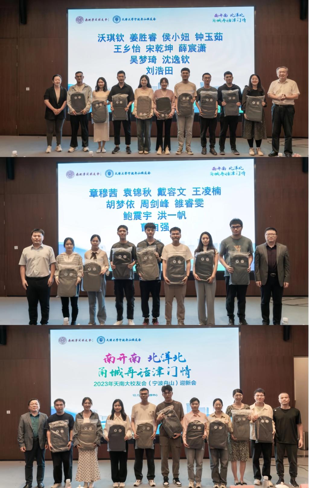 紧接着,许建勇和高喜麟分别介绍了天津大学、南开大学宁波校友会的情况,欢迎新毕业生们来到宁波工作,同时也为30位新毕业生们送上小礼物,希望他们能深耕宁波,为宁波的高质量发展贡献天南大力量。