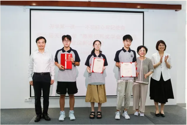 天津大学党委副书记、天津大学校友总会副会长雷鸣(右一),常州市政协原副主席、常州市盛宣怀研究会会长张跃(右二),常州市人大常委会党组成员、一级巡视员徐新民(左一)为获奖新生颁发奖励证书