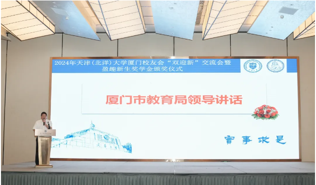 厦门市教育局二级巡视员郑朝南发表讲话。他希望新生们把握机会,接受高等教育滋养,待学成之后再回到厦门,为脚下这片土地打拼。他感谢天津大学为厦门培养优秀输送人才、助力厦门高质量发展,并感谢厦门校友会、厦门校友们为厦门经济建设、城市发展做出的贡献。