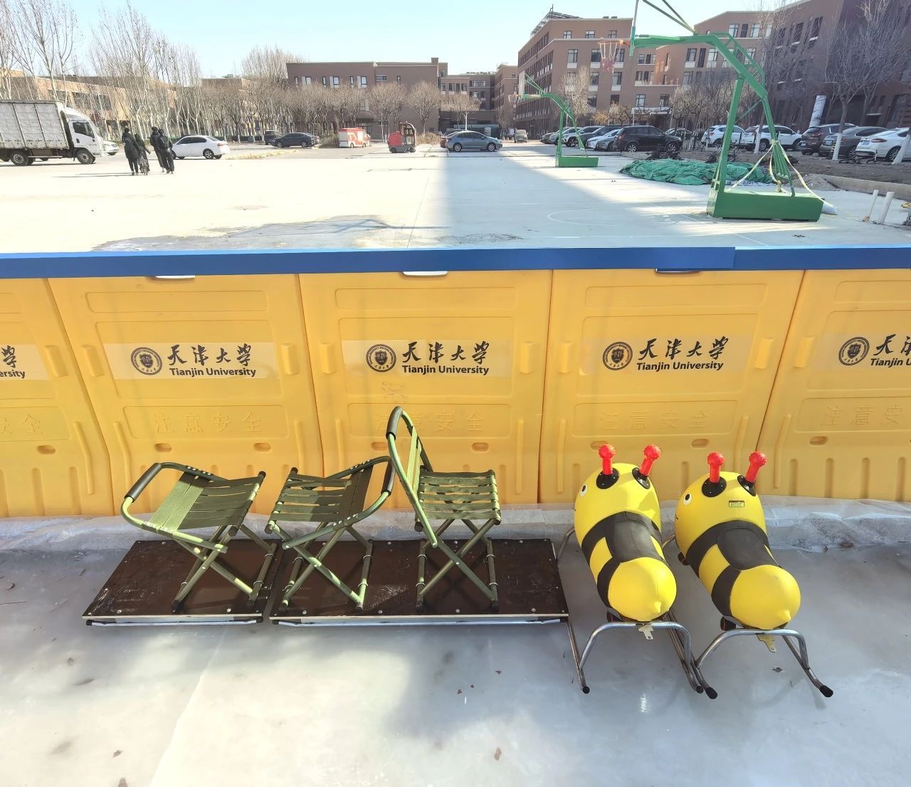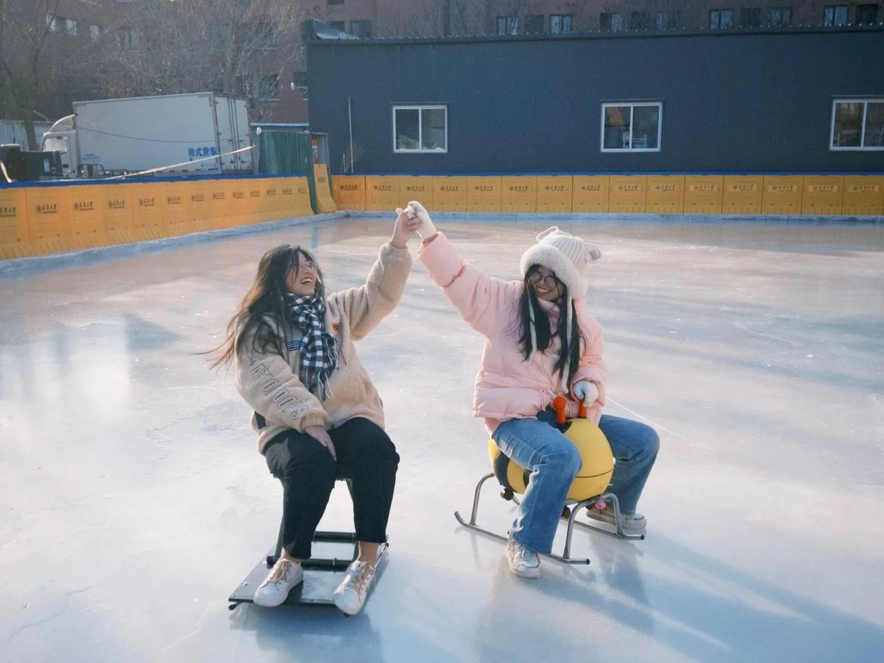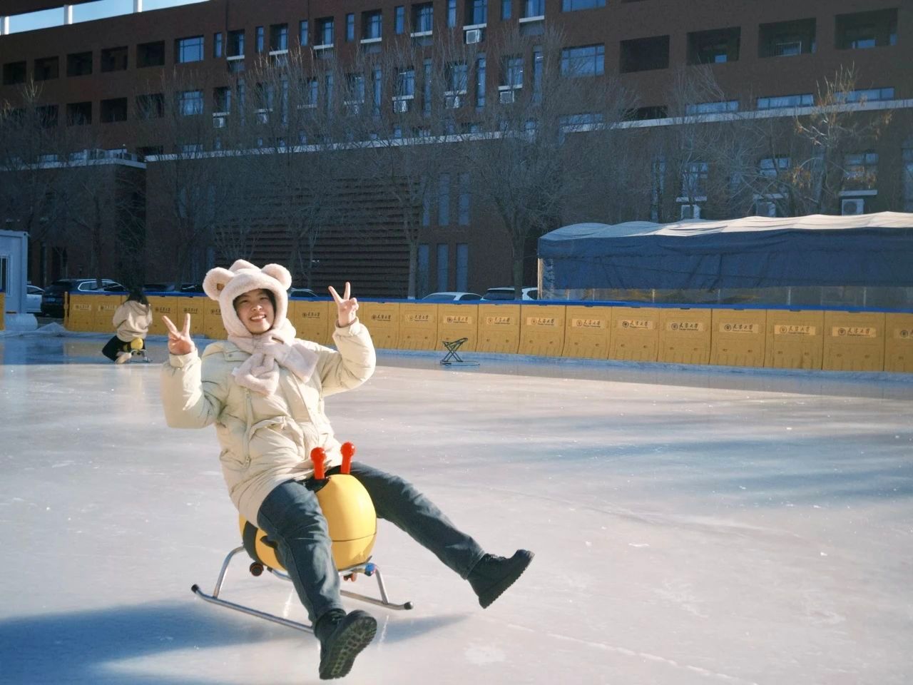 记者在现场看到,位于北洋园校区55教北侧的滑冰场虽不算大,却也别有洞天。这里设有单人滑冰车,滑板轻巧,操控灵活,新手能快速上手,畅享冰上滑行的快感;双人滑冰车稳稳当当,两人同乘,交流互动,增进感情;卡通小蜜蜂滑冰车则充满童趣,滑板造型可爱,色彩鲜艳,坐在上面可以尽感冰上滑行的乐趣。